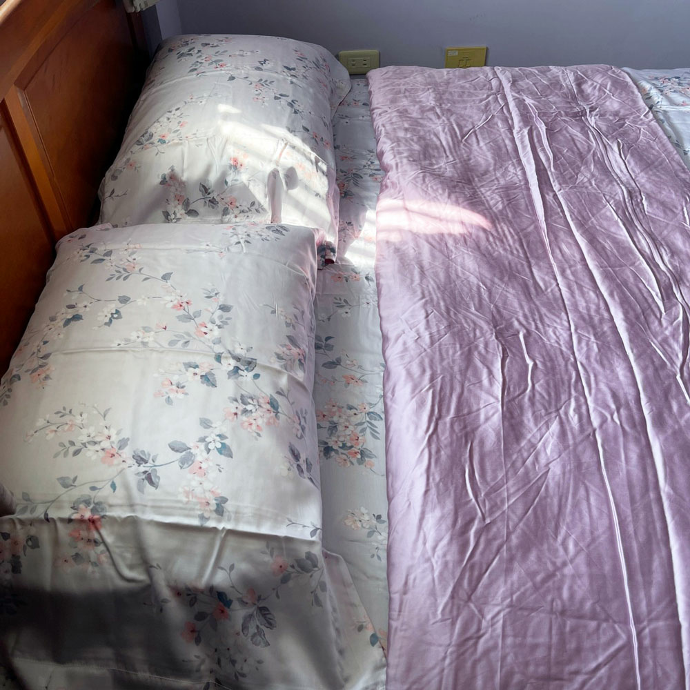主臥的部分,老婆喜歡粉色,這款素雅耐看,我們挑天絲材質,摸起來非常柔順、光滑,柔軟親膚。我們家在挑選床包組這部分有個堅持,就是要枕套、棉被、床包都用一整套!